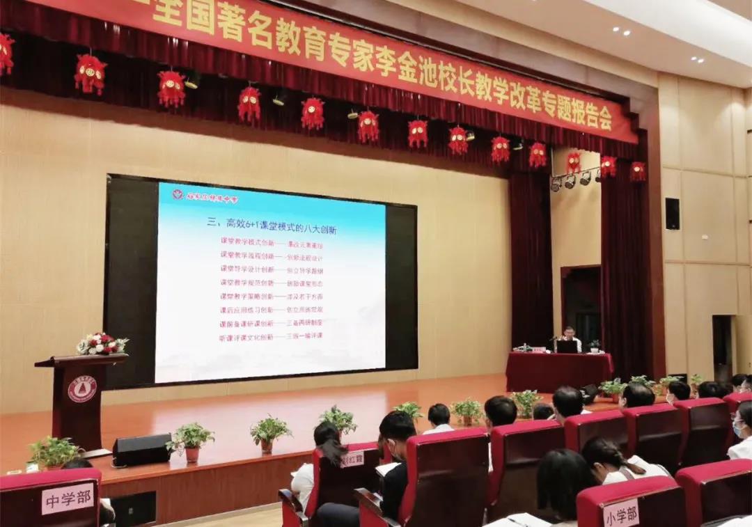李金池先生于1992年擔(dān)任河北省衡水中學(xué)校長,他用12年時間將這所全縣倒數(shù)的薄弱學(xué)校辦成享譽全國的名校,創(chuàng)造了教育神話;2010年他又出任石家莊精英中學(xué)校長,短短3年,又讓這所面臨生存危機的民辦學(xué)校起死回生,一躍成為省級示范學(xué)校、全國課改名校,再創(chuàng)教育奇跡。他也因此被授予全國優(yōu)秀教師、首屆全國十佳卓越校長等榮譽稱號。作為教育界的“學(xué)者型領(lǐng)導(dǎo)”和“教育改革的拓荒者”,李金池校長在報告會上穿插援引自身多年教育經(jīng)驗及教育教學(xué)理論研究成果,分享了他經(jīng)過長期探索,總結(jié)形成了由“導(dǎo)”“思”“議”“展”“評”“檢”“用”等七環(huán)節(jié)組成的獨特的“高效‘6+1’教學(xué)模式”, 顛覆了傳統(tǒng)的教育觀念和教學(xué)認(rèn)知,引發(fā)了教學(xué)模式、教學(xué)策略、教學(xué)流程、教研方式等多方面的變革,有效培養(yǎng)了學(xué)生的學(xué)習(xí)熱情、主體意識、創(chuàng)新精神和實踐能力,學(xué)校教學(xué)質(zhì)量飛速提高。該項目獲評“第五屆全國教育改革創(chuàng)新案例”“教學(xué)改革優(yōu)秀成果獎”。